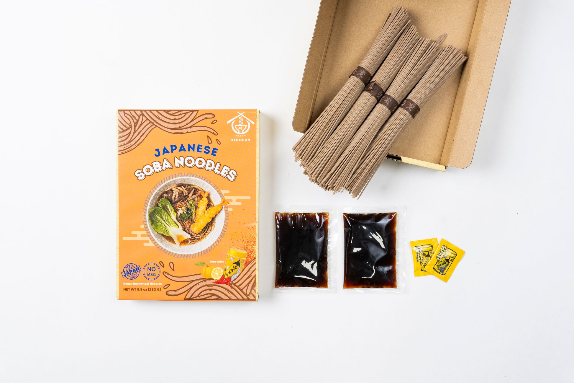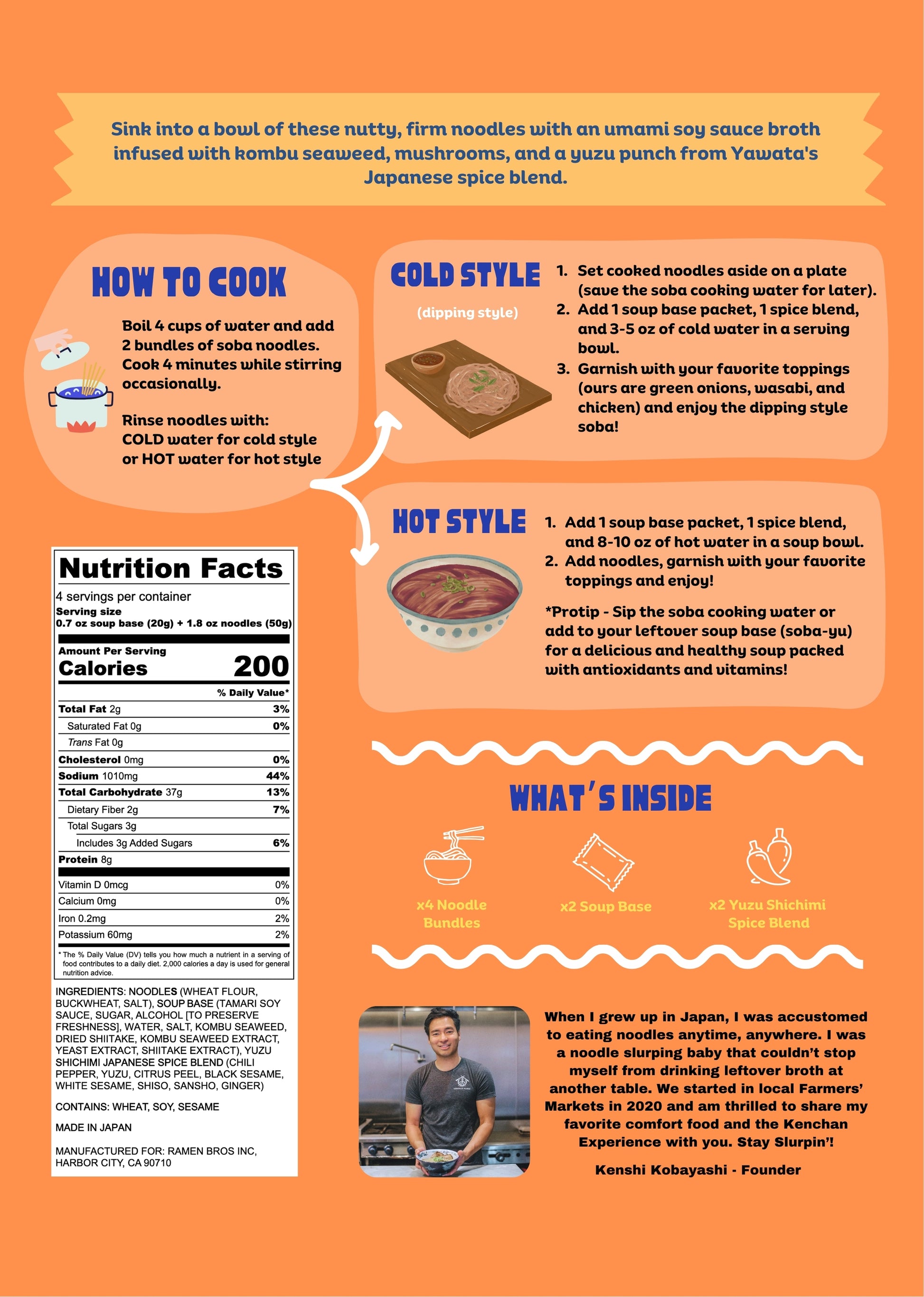 Kenchan Soba noodles are low in sodium, high in protein, and best enjoyed as hot soup noodles, cold dipping noodles, or as a cold noodle salad!