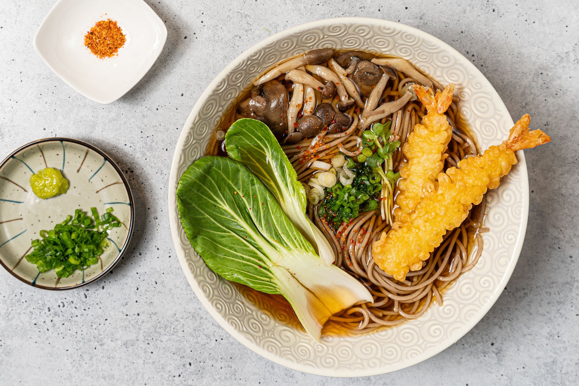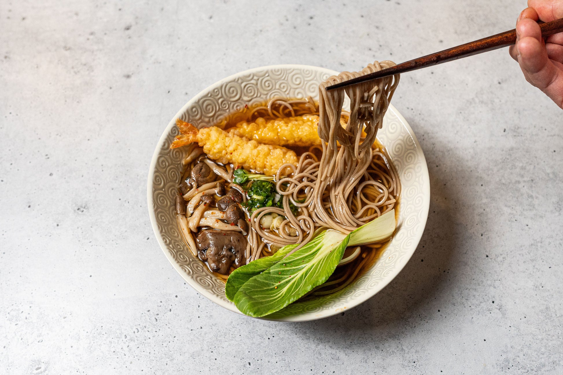 Sink into a bowl of these nutty, firm noodles with an umami soy sauce broth infused with kombu seaweed, mushrooms, and a yuzu punch from Yawata's Japanese spice blend.